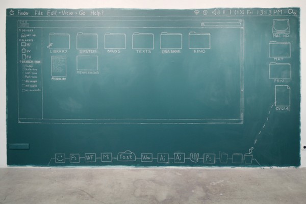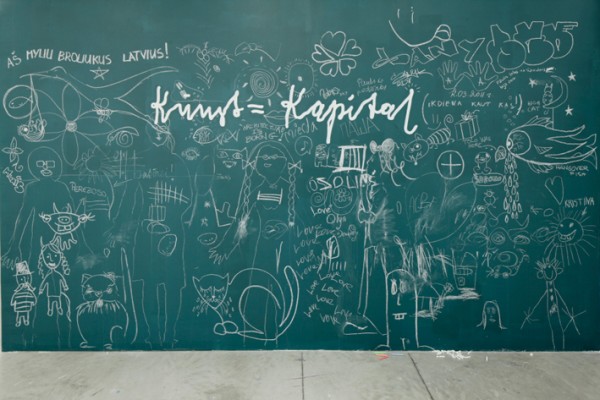 Kunst is the German word for “art.” Taken together with the ephemeral nature of chalk drawings and the fact that Liena’s art is close to the concept of social sculpture, this points to a very specific reference – the work of Joseph Beuys (1921-1986), who created conceptual icons by writing the equation “KUNST=KAPITAL” on a blackboard and, thus, expanding the concept of art to an influential principle that would strike a balance among power, money and the creative spirit.